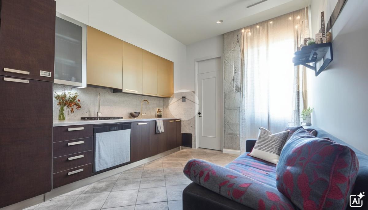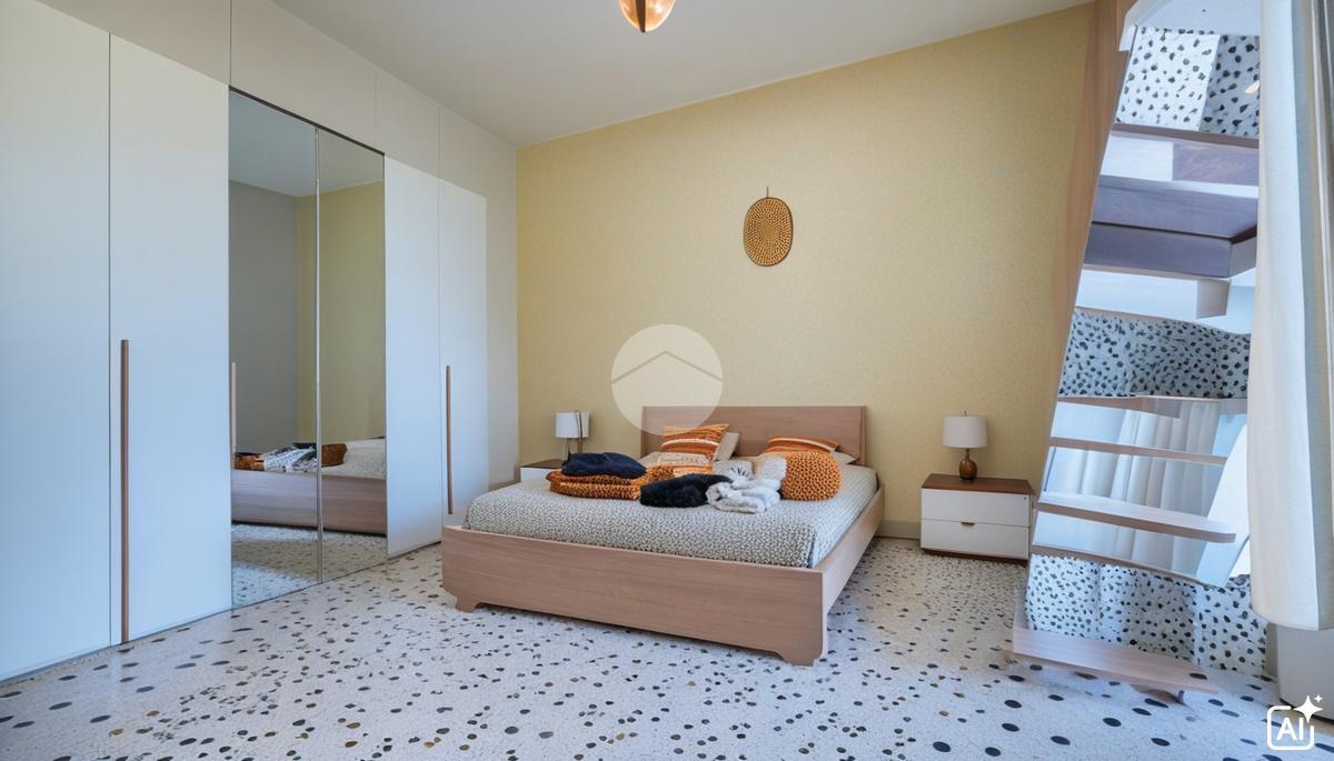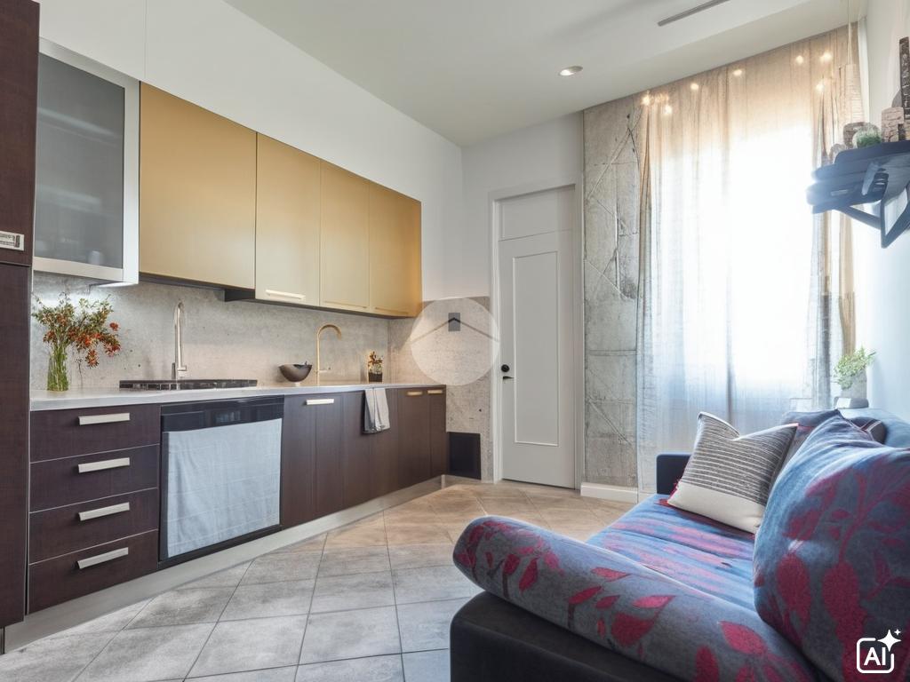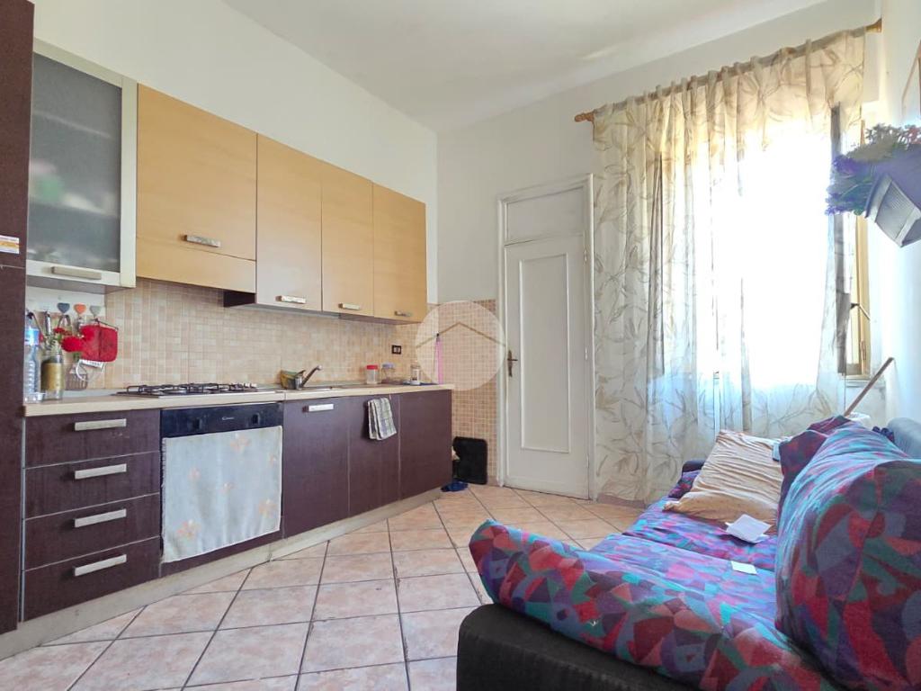 La casa si apre su un ingresso che conduce a un disimpegno, dal quale si distribuiscono gli ambienti principali. La zona giorno, composta da una cucina e un soggiorno adiacente, è uno spazio funzionale e luminoso, facilmente trasformabile in un moderno open space. La camera da letto matrimoniale e il bagno offrono spazi ben definiti e un pratico ripostiglio completa la proprietà. I pavimenti in graniglia, tipici dell'epoca, e i soffitti alti conferiscono all'appartamento un fascino unico. Le porte interne sono in legno e gli infissi in alluminio.